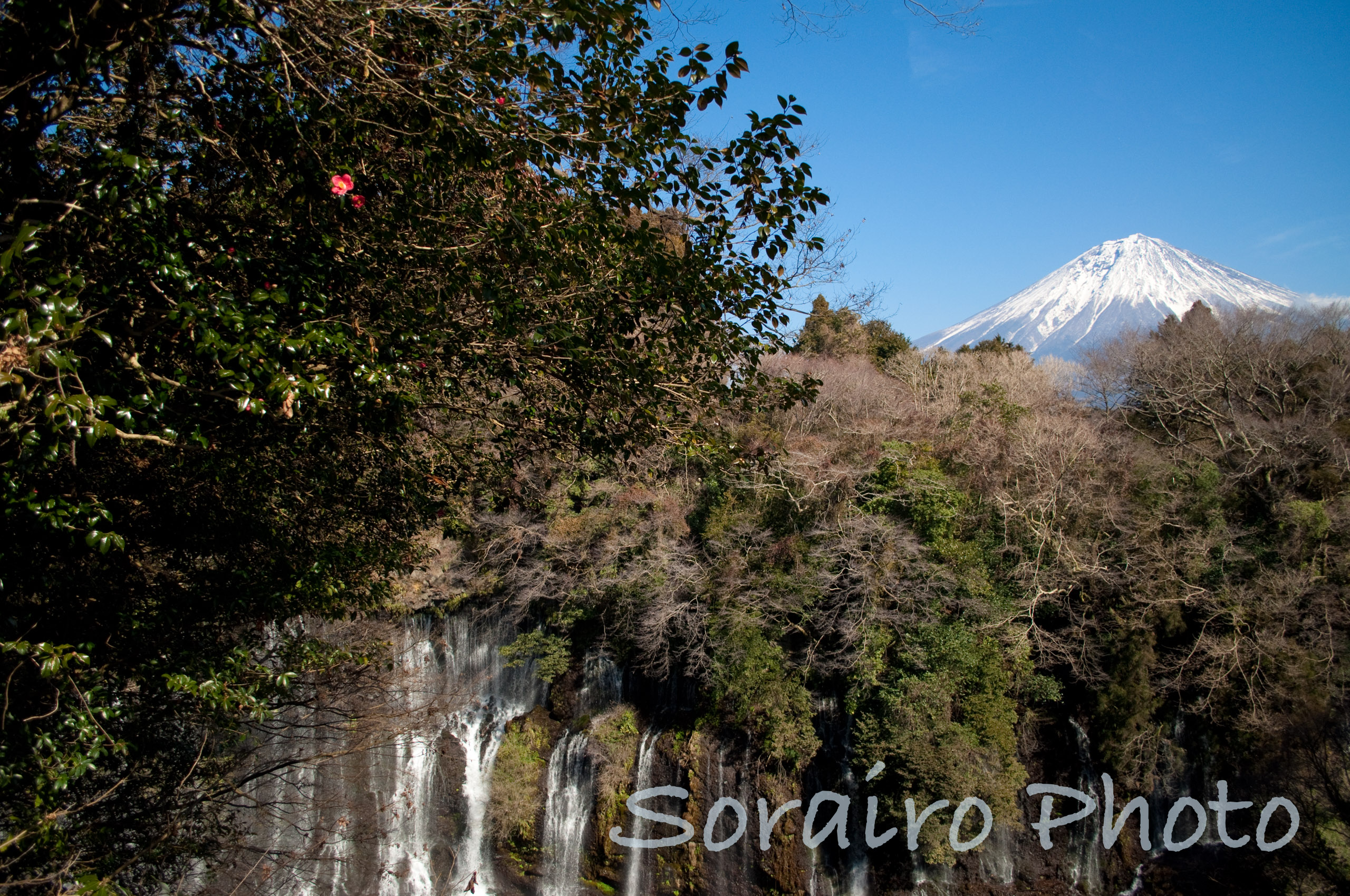 富士山を背にした白糸の滝を撮影しました。手前には柵が設けられていたため、柵が入り込まないよう高い位置で構図をとりました。